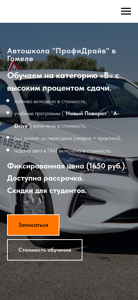 | AI-анализ | language: ru --- The web project "Автошкола ПрофиДрайв в Гомеле" offers driving school services in Gomele, Belarus. The package includes fuel, all retakes, and vehicle registration with the traffic police. Optimal pricing and quality education are promised. A fixed price of 1650 rubles and a financing option are available. Students receive discounts. The school teaches to the category "В" with a high pass rate. Usage of "Новый Поворот" and "A-Drive" programs are included in the price, with no additional fees for retakes in theory and practice. The phone number for consultation and group registration is +375 (33) 635 25 35. The office and classroom are located at "Пушкин Плаза," ulitsa Pushkina |
