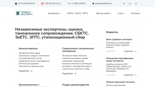 | AI-анализ | url: / The website is a Belarusian business, named "ПравитЭксперт" (Pravitexpert), offering various types of expertises and evaluations for different objects and services. These include judicial and pre-trial expertises, appraisals of real estate, land, and assets, as well as technical and document expertises. The company provides services related to customs declaration processing, technical inspections, and surveying. Additionally, they offer consulting services and quality control of construction works. The website's main focus is on expertises and appraisals, with sections dedicated to automotive expertises, construction and technical expertises, economic and accounting expertises, and property appraisals. The contact information provided includes phone numbers for Belarus and Russia, and an email address. |