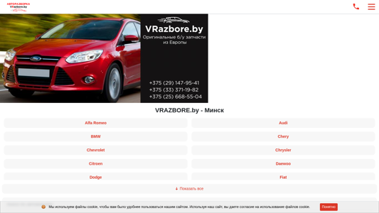 | AI-анализ | --- The portal VRAZBORE.by from Minsk is an online marketplace for used auto parts in Belarus. It offers over 1000 parts available for purchase in Minsk and across Belarus. Users can search for parts by car brand, model, generation, and engine type or fuel type. The website provides information on the availability of parts, and offers consultations. The top search terms include 'benzin' (gasoline), 'mkpp' (manual gearbox), 'наличии' (availability), 'консультация' (consultation), and 'цена' (price). The website also features sections for specific auto brands such as Alfa Romeo, Audi, BMW, Chery, Chevrolet, Chrysler, Citroen, Daewoo, Dodge, Fiat, Ford, Great Wall, Honda |