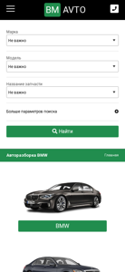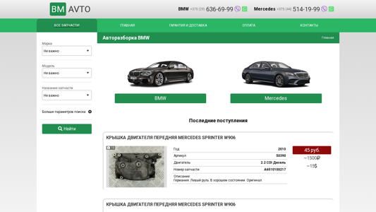 | AI-анализ | This website is an automobile parts reseller, specializing in BMW and Mercedes, offering delivery and warranty. The title is "Авторазборка б/у запчастей" which translates to "Used Auto Parts Resale". The description contains the keywords "запчасти" (parts), "доставка" (delivery), and "гарантия" (warranty). The top words indicate the brands Mercedes and BMW, and the words "запчасти" and "год" (year) appear frequently. The website has sections for "Каталог запчастей" (catalog), "Гарантия и доставка", "Оплата" (payment), and "Контакты". The contacts provided are for BMW and Mercedes, with phone numbers for Belarus. The search filters include mark, model, |