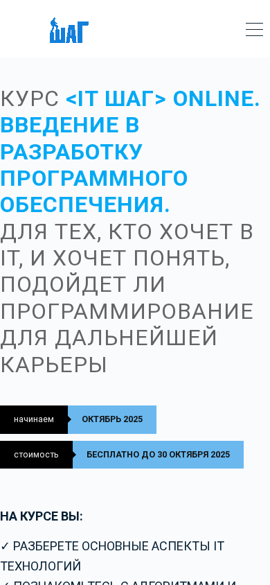 | Название / Заголовок | КУРС <IT ШАГ> ONLINE ДЛЯ ТЕХ, КТО ХОЧЕТ В IT, И ХОЧЕТ ПОНЯТЬ, ПОДОЙДЕТ ЛИ ПРОГРАММИРОВАНИЕ ДЛЯ ДАЛЬНЕЙШЕЙ КАРЬЕРЫ |