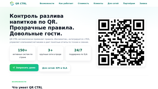 | AI-анализ | This website, titled "QR CTRL," is a control system for beverage pouring and analytics specifically for the HoReCa (Hotel, Restaurant, Cafe) industry. The website highlights its transparency, client satisfaction, and integration with POS (Point of Sale) systems. QR CTRL automatically applies 'no-limit' rules, manages taps/counters, and provides clear reports at points and shifts. With over 150 active systems nationwide, QR CTRL works with three major chains in the industry and offers 24/7 support. The system includes QR-access to pouring, individual and guest QR, temporary or repeat limits, POS integration, and anti-fraud security features. Reports and analytics are also provided. The guest scans a QR code from their check or app at the pouring station, and the |