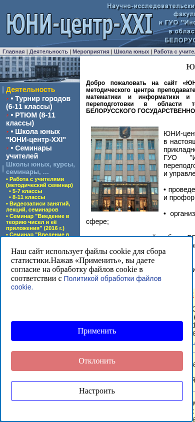 | AI-анализ | The web project "ЮНИ-центр-XXI" is a website primarily focused on mathematics education for students from 5 to 11 years old and mathematics research for older students. The website uses cookies for statistical data collection and hosts various mathematics competitions, including city, regional, and international tournaments, as well as Olympiads. It provides resources for teachers such as seminars and workshops. The website also offers an electronic journal for publications and hosts various conferences and research contests. The domain is uni.bsu.by. |