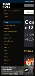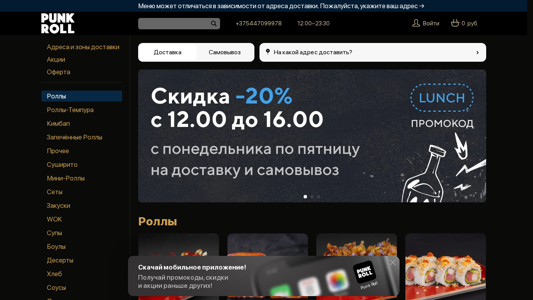 | AI-анализ | --- This website is an online ordering platform for sushi rolls and other Japanese dishes from the restaurant "Punk Roll" located in Grodno, Belarus. The menu offered includes various rolls, tempatu, sushi, bowls, desserts, and bread with soups. Prices for dishes are given in Belarusian rubles and calories per 100 grams, and customers can order for delivery or pick up. The website provides contact information for ordering, and delivery areas and promotions are specified. The homepage features a title "Пunk Roll Гродно" and a description "Мы для тебя роллы свернём!" (We'll roll sushi for you!). Keywords associated with the website include "rolls," "menu," "delivery," and "Belarus." |