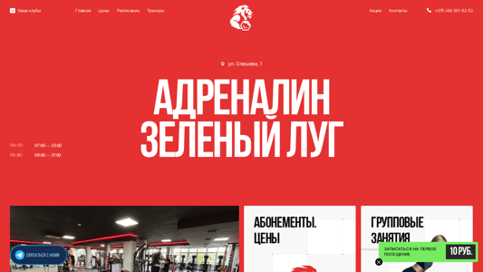 | AI-анализ | This online resource represents the website of Fitness-center "Adrenaline" located at Oleшева, 1 in Zeleny Luh, Minsk. The website provides information on the best prices for fitness classes in the gym, offering new equipment and experienced fitness instructors. Users can contact the center using the provided phone number for more details, schedule, or to book an appointment. The website includes sections for pricing, schedule, trainers, and special offers. The gym is open from Monday to Thursday: 7:00 AM - 11:00 PM and 9:00 AM - 9:00 PM on Friday, Saturday, and Sunday. The website also offers various fitness programs, with the option to purchase an 'Halfvka' card for discounted rates on group classes. Comfortable training sessions take place in clean, modern halls equipped with climate control and |