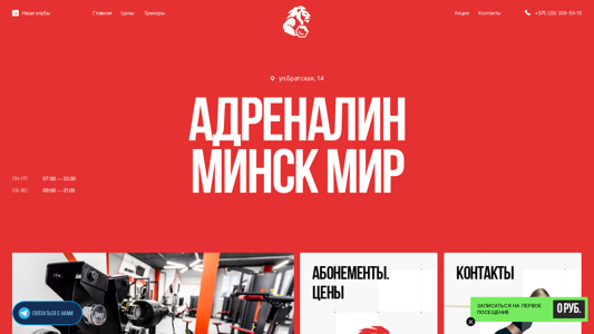 | SEO-описание | Фитнес-клуб Адреналин на ул. Братская, 14 ✔Современное оборудование ✔Опытные тренеры ✔Доступные цены на занятия в тренажерном зале ☎ +375 29 339-50-15 |