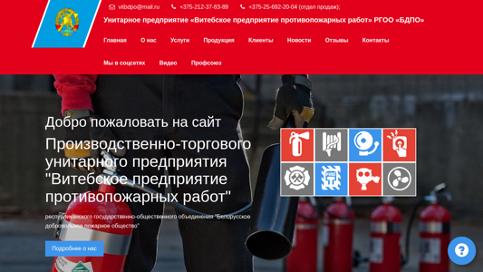 | AI-анализ | This website is for the Unitary Enterprise "Vitebsk Fire Safety Works" of the Republican State-Public Organization "Belarusian Voluntary Fire Society" (RGOO "BDP"). The company offers various fire safety services and products, including the repair and recharging of powder, gas, and carbon dioxide fire extinguishers, fireproof coating for wooden, metal, and concrete structures, and the installation and repair of lightning protection systems, gas pipeline inspections, and the sale of fire safety equipment and supplies. The company emphasizes modern, quality service, individualized and competent approaches to clients, flexible payment methods, and the mobility and high qualification of their teams to perform work on various objects of different complexity levels simultaneously. Services include the repair and recharging of various types of fire extinguishers, fireproof coating for structures, lightning protection system installation and |