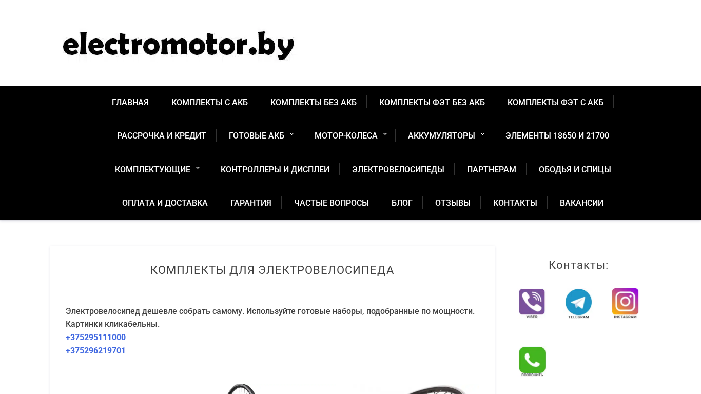 | SEO-описание | Всё для сборки электровелосипеда. Мотор-колеса, аккумуляторы, контроллер на электровелосипед. Доставка по РБ. Купить в Минске. |