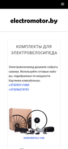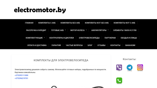 | AI-анализ | --- This online resource is dedicated to providing components for assembling an electric bicycle. It offers motor-wheels, batteries, and controllers for electric bicycles. Delivery is available in Belarus. Purchase in Minsk. The website's top keywords include 'akb', 'плек', 'ком', 'элек', 'тро', 'ные', 'кон', 'без', 'гото', 'вые', 'сти', 'кор', 'акку', 'фэт', 'щие', 'руч', 'датчики', 'доставка', 'так', 'мен'. The website consists of sections for complete kits with batteries, kits without batteries, fat tire kits without batteries, and fat tire kits with batteries. There are also sections for motor-wheels, batteries, controllers, and various accessories and elements. These elements include |