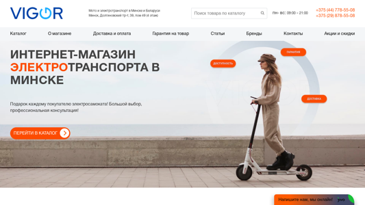 | SEO-описание | Интернет-магазин электротранспорта Вигор, в магазине Vigor можно приобрести электросамокат, гироскутер, электроскутер, а так же заказать электровелосипед, большой выбор в наличии и под заказ, доставка по Минску и Беларуси, гарантия до 36 месяцев, действуют акции и скидки, звоните 8 044 778 55 08 |