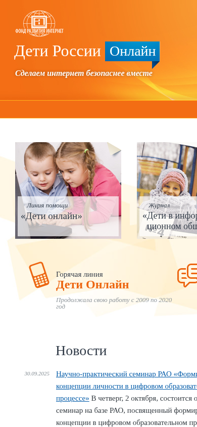 | AI-анализ | This online resource, titled "Дети России Онлайн" (Children of Russia Online), is a website by the Foundation for Internet Development — Children of Russia. The website focuses on ensuring internet safety for children and adults through its "Линия помощи 'Дети онлайн'" (Children Online Help Line) which provides telephone and online consultation services for users dealing with internet and mobile communication safety issues. The site also features a journal, "Дети в информационном обществе" (Children in the Informational Society), which covers the impact of modern information and communication technologies on the lives, upbringing, and personal development of growing generations. Additionally, the site offers educational projects aimed at enhancing digital competence and internet safety awareness among children, teenagers, parents, teachers, and the elderly. Projects include "Дети в интернете" (Children in the Internet), an |