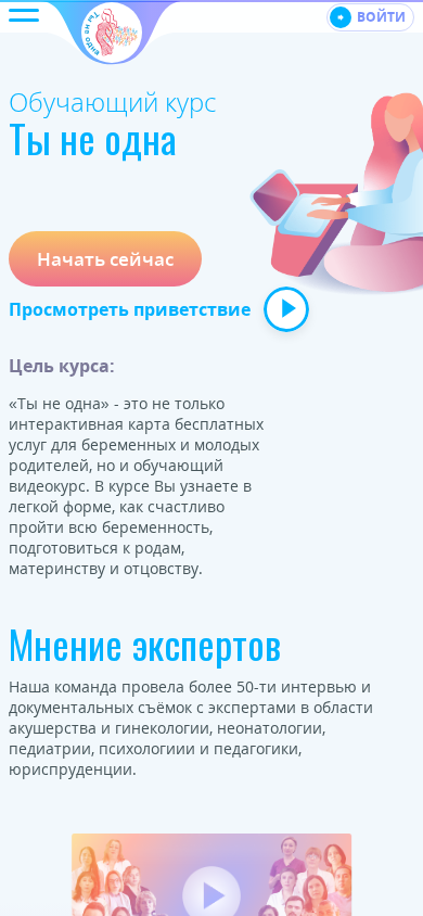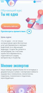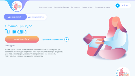 | SEO-описание | Обучающий курс "Ты не одна" рассчитан на будущих родителей. Проект состоит из серии видео и инфографики, разделенных на девять информационных блоков |