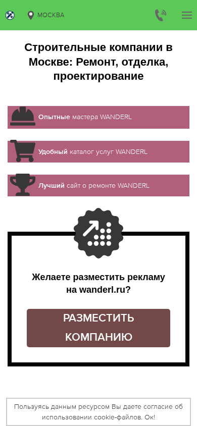 | AI-анализ | --- This online resource is a directory and service provider for construction and repair services in Moscow, Russia. The website offers various services, including restoration of baths, sanitation services, cleaning of spaces, drilling of wells, waste removal, and the provision of shelters for vehicles. Users can make inquiries and place requests through the site or by contacting a listed phone number. The website features a menu for easy navigation, and includes sections for companies offering building services, such as repairs, renovations, and project design. WANDERL is the brand name for the company that operates the site, which is described as offering a convenient catalog of services and being the best site for repair work in Moscow. The site also provides information on the availability of advertising space for companies. The top keywords associated with the site include "moscow," "wanderl," and various terms related to construction and repair services, such as "restoration |