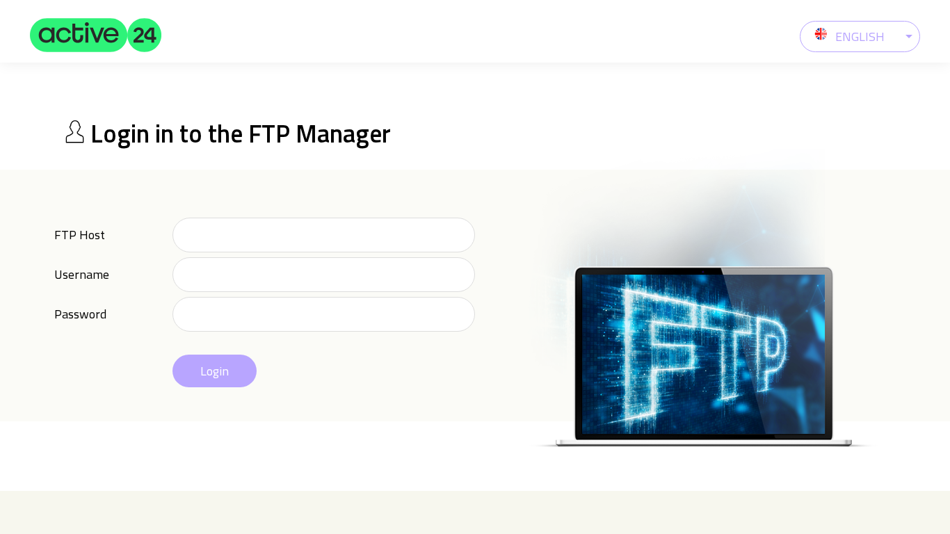 | AI-анализ | The portal Active24 - WebFTP is a secure FTP manager for managing and transferring files using FTP (File Transfer Protocol). Users can log in with their unique username and password, and choose their preferred language from Español, Čeština, Deutsch, English, or Nederlands. The portal offers an advanced interface, allowing users to save login details for easy access. Additionally, it provides options for passive mode and SSL connection. The Active24 company, which operates the portal, offers various web services including webmail, MySQL and MSSQL databases, and web hosting. Users can find information about the company, its terms and conditions, and contact details on the portal. |
