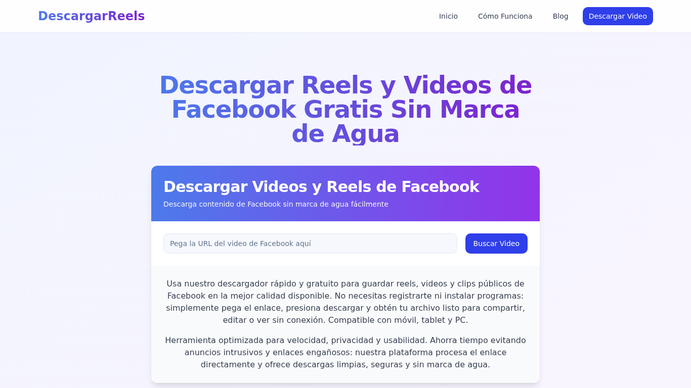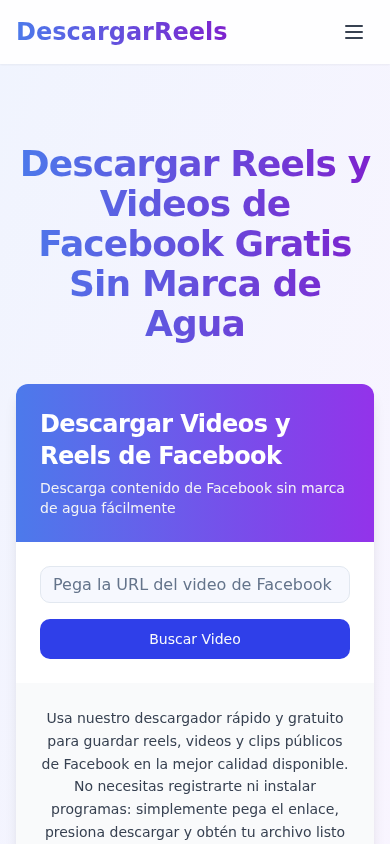 | SEO-описание | Descargador de Reels y Videos de Facebook Gratis. Descarga reels, videos y contenido de Facebook sin marca de agua. Compatible con Android y todos los dispositivos. |