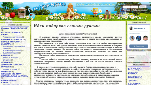 | AI-анализ | --- The portal Rukoтворчество (Handicraft) is a creative handicraft website offering exclusive handmade gifts, ideas for presents, and free master classes on various handicraft techniques. The website caters to those who appreciate unique forms of handicraft, seek original gift ideas for loved ones, and wish to share their experiences. The site features creative handmade items and master classes on various handicrafts, including jewelry, embroidery, interior design, flowers, sewing, and cooking, all easily made with your own hands. The creator of the site expresses a long-standing passion for handicrafts, from childhood memories of sewing and embroidery to discovering new crafts through the internet, such as kantha, bonsai, and new embroidery techniques. The site encourages exploration and experimentation in handicrafts, from building doll houses and making |
