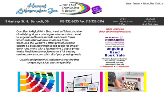 | AI-анализ | The portal hanlit.com is a business website for Hannah Lithographers Inc., a printing company located in Bancroft, Ontario. The site offers various printing services including offset and digital printing. The description mentions two offset presses, two colour copiers, and a black laser high speed copier. Additional services include graphic design, binding, collating, folding, numbering, perforations, scoring, and trimming. The website also provides hosting and domain name registration, as well as photography services for passport, citizenship, and firearms (PAL) photos. The domain name costs between $18.00 and $25.00 per year, and hosting costs $95.00 per year with up to 10 email addresses and unlimited storage space. Site creation pricing is not specified in the provided data. The site is mobile web friendly and offers e-commerce |