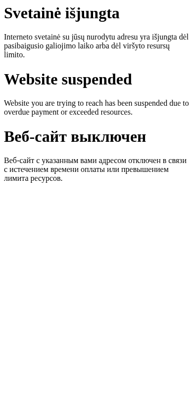 | AI-анализ | This website, titled "Svetainė išjungta" (which translates to "Website suspended" in English), is a suspended .BY domain. Users attempting to access this web resource with the provided address are met with a notification stating that the website has been suspended either due to an overdue payment or exceeded resource limitations. This information is also conveyed in the Russian language. |