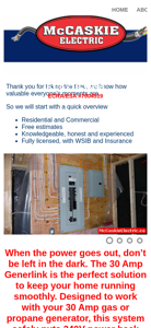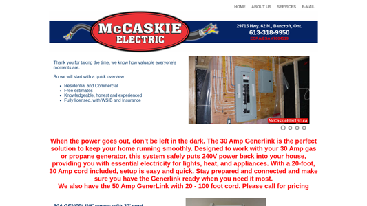| AI-анализ | The portal McCaskie Electric is a website dedicated to providing electrical services in Bancroft, Ontario. The company offers residential and commercial electrical services, including free estimates, and is fully licensed with WSIB and insurance. During power outages, the portal provides a solution with the 30 Amp Generlink, which safely puts 240V power back into a house, ensuring essential electricity for lights, heat, and appliances. The portal also sells electrical supplies, such as low voltage LED exterior lights, gas and propane generators, and cottage wiring. Their specialties include electrical service upgrades, LED lighting, and propane generators. The website provides free quotes on all projects and offers a $50.00 free gift certificate on all propane Generac generators. |
