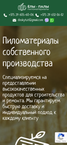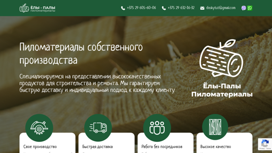 | AI-анализ | --- This online resource is dedicated to selling wood products of its own production under the brand Ёлы-палы. The website offers various types of boards, beams, and wood chips. The company operates its own sawmill and has a warehouse on the premises for quick delivery. The products are suitable for construction and repair projects, and the company guarantees fast delivery and individual customer service. The website lists specifications and prices for various sizes and types of boards and beams, and also offers delivery, as well as additional services such as wood chip production, custom cutting, and IPPS stamping. The company has its own logging vehicle for transporting raw materials and timber. The website mentions discounts for building organizations and bulk buyers, as well as loyalty programs and bonuses. The contact details for the company are provided. |