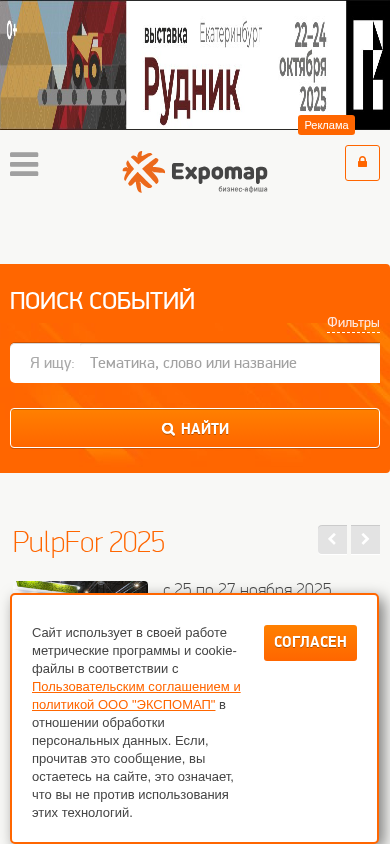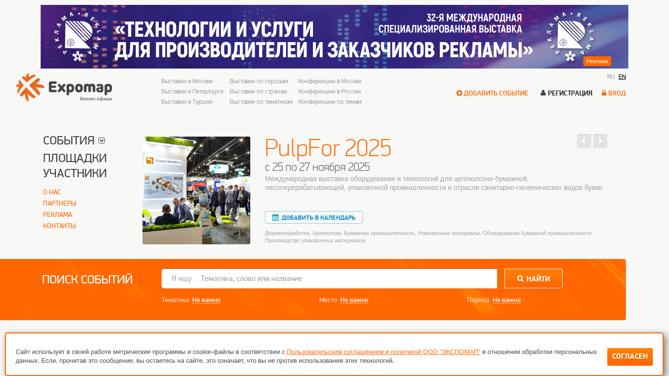 | AI-анализ | The portal Expomap is a business events calendar featuring exhibitions, conferences, and seminars. It provides announcements and business breakfasts for entrepreneurs and networking opportunities. The comprehensive list of business events aims to help increase a company's clean profit in the 2025-2026 period. The website uses metric programs and cookie-files according to the User Agreement and UtiloMap LLC's data processing policy. By staying on the site, users agree to this usage. Events include those in Moscow, Russia, and other countries, as well as by theme, such as UtiliCon 2025, focusing on communal services, construction, and city management, or PulpFor 2025, dedicated to cellulose, paper industry, and packaging materials. MITEX 2025 covers building equipment, woodworking, furniture production, and industrial equipment. InterCHAR |