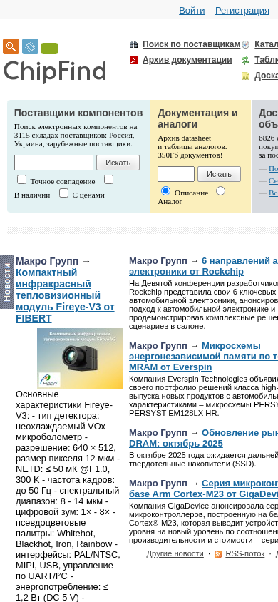 | AI-анализ | --- This online resource, ChipFind.ru, is an electronic components and radio parts search system connecting users to online inventories and price lists from suppliers. It offers a documentation archive and compatibility tables for components. The website includes a search engine for electronic components across 3115 stockists in Russia, Ukraine, and international suppliers, with options for availability, pricing, documentation, and analogs. Users can access recent news in the industry, contacts, a catalog, and a notice board for buying and selling radio components. The website features a macro group section showcasing a compact infra-red thermal imaging module, Fireye-V3, from FIBERT. Key features of Fireye-V3 include a non-cooled VOx microbolometer sensor, 640 × 512 resolution with 12 μm pixel size, low noise equivalent temperature difference (NETD) |