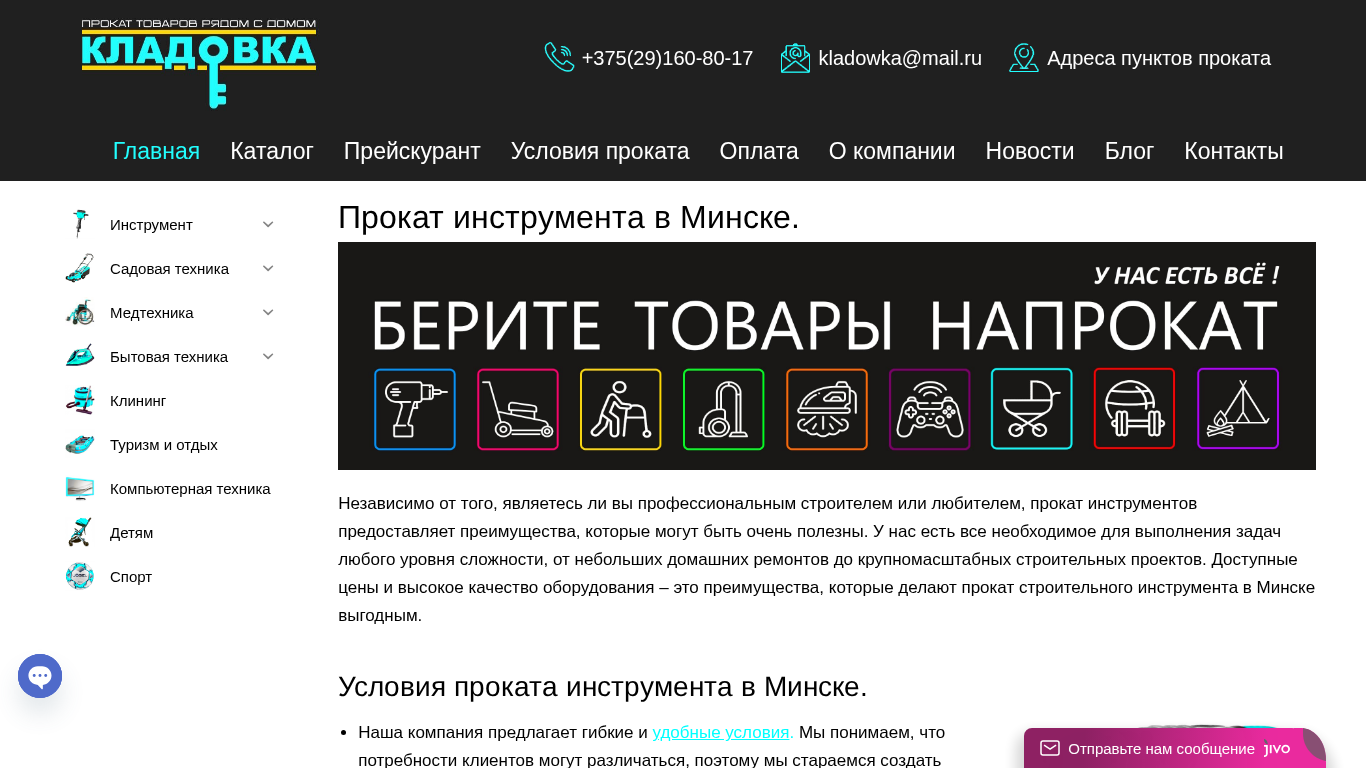 | AI-анализ | --- The portal Kladowka.by offers instrument rental in Minsk with a large selection at affordable prices. Whether you are a professional builder or a home hobbyist, renting tools provides valuable benefits. The company has all the necessary equipment for tasks of any complexity, from small home repairs to large-scale construction projects. Affordable prices and high-quality equipment are advantages that make renting building tools in Minsk an attractive option. The rental service is available to both physical and legal entities, ensuring optimal solutions for personal or corporate needs. Simply contact the company using the phone number provided on the site. |