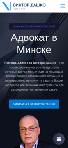 | AI-анализ | --- The website "Victor Dashko.by" is an advocacy service based in Minsk, Belarus. The site features a main navigation menu with various specializations of the law firm, including banking, civil, family, administrative, criminal, and consumer protection cases. The site also offers legal assistance for foreign citizens, as well as help with debt recovery, DTP (road traffic) cases, and the supervision of construction projects. The site provides contact information, including an email address and a phone number, and offers an option to schedule a consultation. The site's title is "Адвокат в Минске Виктор Дашко" (Advocate in Minsk Victor Dashko), and the keywords include "адвокат" (advocate), "делам" (cases), "минске" (Minsk), "дашко" (D |
