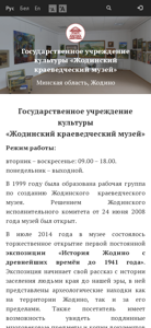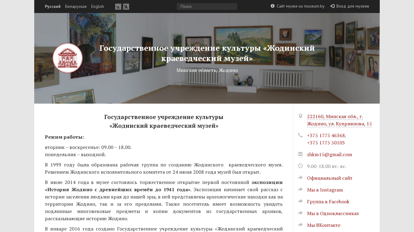 | SEO-описание | Государственное учреждение культуры «Жодинский краеведческий музей» — новости и афиша мероприятий, информация для посетителей, цены, экспозиция, коллекции, материалы для музейщиков. |
