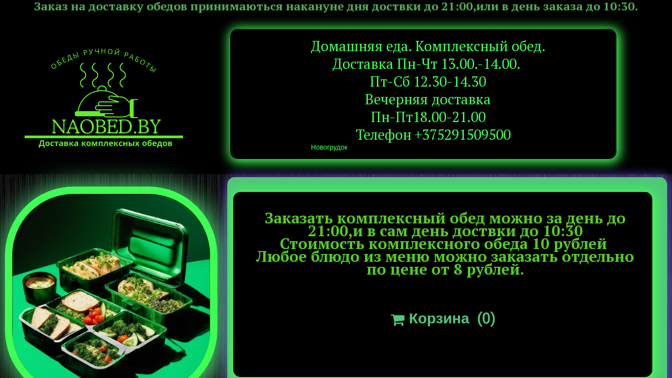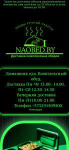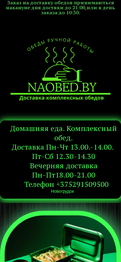 | AI-анализ | --- The portal Naobed.by offers complex meals for delivery in Novogrudek, along with homemade half-finished products. Orders for delivery of meals can be placed up to the day before the delivery day until 21:00, or on the day of the delivery until 10:30. The menu includes various dishes, with prices starting at 8 rubles per item. The delivery schedule is Monday to Thursday from 13:00 to 14:00, Friday and Saturday from 12:30 to 14:30, and evening delivery on Monday to Friday from 18:00 to 21:00. Half-finished products, such as cabbage rolls, lasagna, vegetable casserole with chicken fillet, potato casserole with bacon, and various types of blinis, can be ordered |