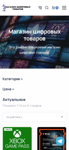 | AI-анализ | The website 'Магазин цифровых товаров' (Digital Goods Store) is a demonstration shop selling digital products. The shop offers various categories including software, video games for consoles and PCs, educational courses, subscriptions, digital books, and actions. Some featured items are Xbox Game Pass Ultimate monthly subscription priced at 600 RUB, Wink subscription for 6 months at 500 RUB, and Yandex Plus subscription for 3 months at 500 RUB. Software items include Kaspersky Standard one-year subscription for 5 devices at 500 RUB and a Windows 11 Pro key activation at 500 RUB. Video games include Assassin's Creed Odyssey for Xbox One, Xbox Series S, and Xbox Series X, priced at 500 RUB, and Tom Clancy |