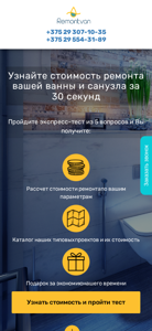| AI-анализ | --- This website is dedicated to bathroom and toilet repair services in Minsk, Belarus. It offers a professional full-service repair, with over 10 years of experience and a guarantee for the results. The website provides adequate pricing and features a express-test to estimate the repair costs within 30 seconds. The homepage showcases several completed projects with their addresses, allowing users to view reviews for similar projects. The website also includes a catalog of typical projects and their costs, as well as an offer for a free tile installation as a reward for choosing their services. The top keywords for this website are "ремонт" (repair), "под ключ" (under key), "туалета" (toilet), "адрес" (address), "меня" (me), "похожий" (similar), "проект" (project), and |