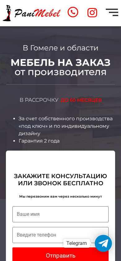 | AI-анализ | --- This online resource is a furniture manufacturing company based in Gomel, Belarus. The website offers custom-made furniture with a catalog showcasing real work examples. Contact information is provided for consultation or a free call. The company produces a wide range of furniture including kitchens, computer desks, wardrobes, children's furniture, furniture for bathrooms, living room furniture, TV cabinets, and various types of shelves and closets. The furniture is manufactured to order and can be customized according to individual designs, with a two-year warranty. Delivery and measurement are free of charge. The company operates officially and has positive customer reviews. |
