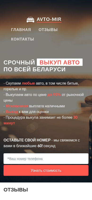 | AI-анализ | This online resource, titled "Срочный выкуп авто по всей Беларуси" (Quick Sale of Cars Across Belarus), is a website dedicated to purchasing vehicles across Belarus. The description mentions that it offers a quick sale with a free visit for evaluation. The website operates in all regions of Belarus, purchasing various types of vehicles including damaged ones. The pricing offered can reach up to 98% of the market value, with immediate cash payment upon deal completion. The website promises a swift process, taking no more than 30 minutes. Users can leave their phone numbers to be contacted within 60 seconds. The site includes customer reviews with high ratings, praising the promptness and professionalism of the service. The company has been active for over 15 years and has completed more than 600 deals in the car buying sector. They provide full legal support for all |