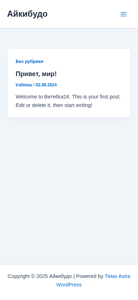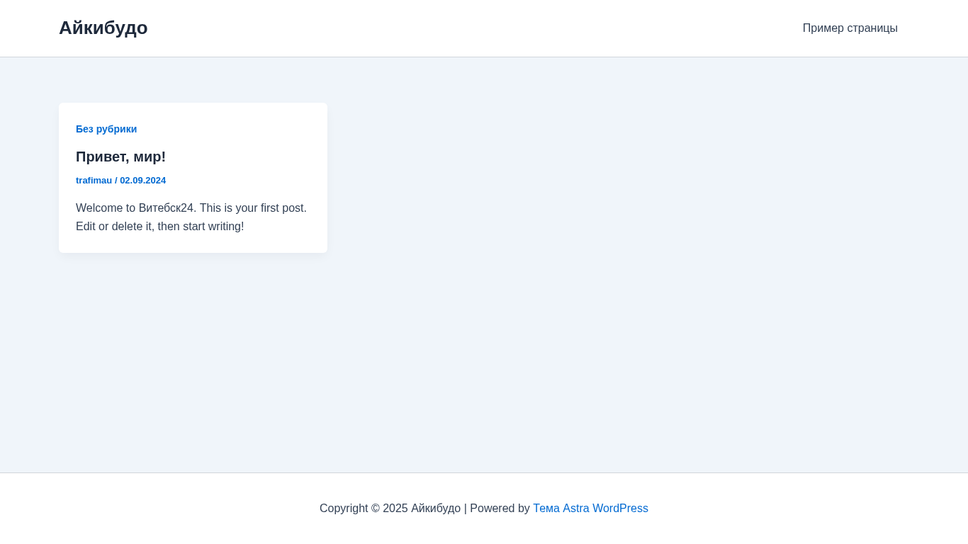 | AI-анализ | This website, titled "Айкибудо," has a description tag that is empty. The most frequently occurring keywords are "айкибудо," "пример," "страницы," "перейти," "содержимому," "main," "menu," "без," "рубрики," "привет," "мир," "трафимау," "2024," "welcome," and "витебск24." The homepage contains a greeting "Привет, мир!" and a welcome message "Welcome to Витебск24. This is your first post. Edit or delete it, then start writing!" along with a main menu and a link to "Перейти к содержимому" (Go to content). The website is built using the Astra WordPress theme. |