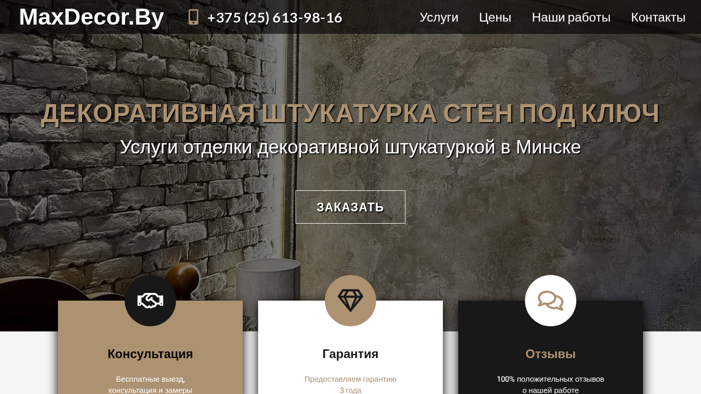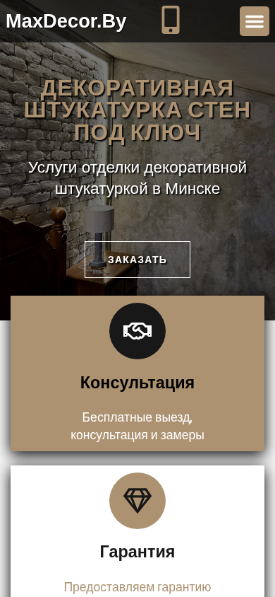 | AI-анализ | --- The portal MaxDecor.By is a decorative plastering services provider based in Minsk, Belarus. The website offers decorative plastering services for walls, using advanced techniques and premium materials. Visitors can find information about their services, prices, and contact details on the site. The company guarantees a three-year warranty and boasts 100% positive customer reviews. Customers can also request free consultations and measurements. The site encourages clients to share their desired decorative plastering styles, even if they find them online, and promises to create unique, individual works based on their preferences. The services include innovative design ideas, stylish and new interior concepts, and execution of complex designs. The site also promotes a specific decorative plastering technique called 'Wet Silk', which offers a luxurious and elegant texture for interiors, particularly suitable for living rooms, |