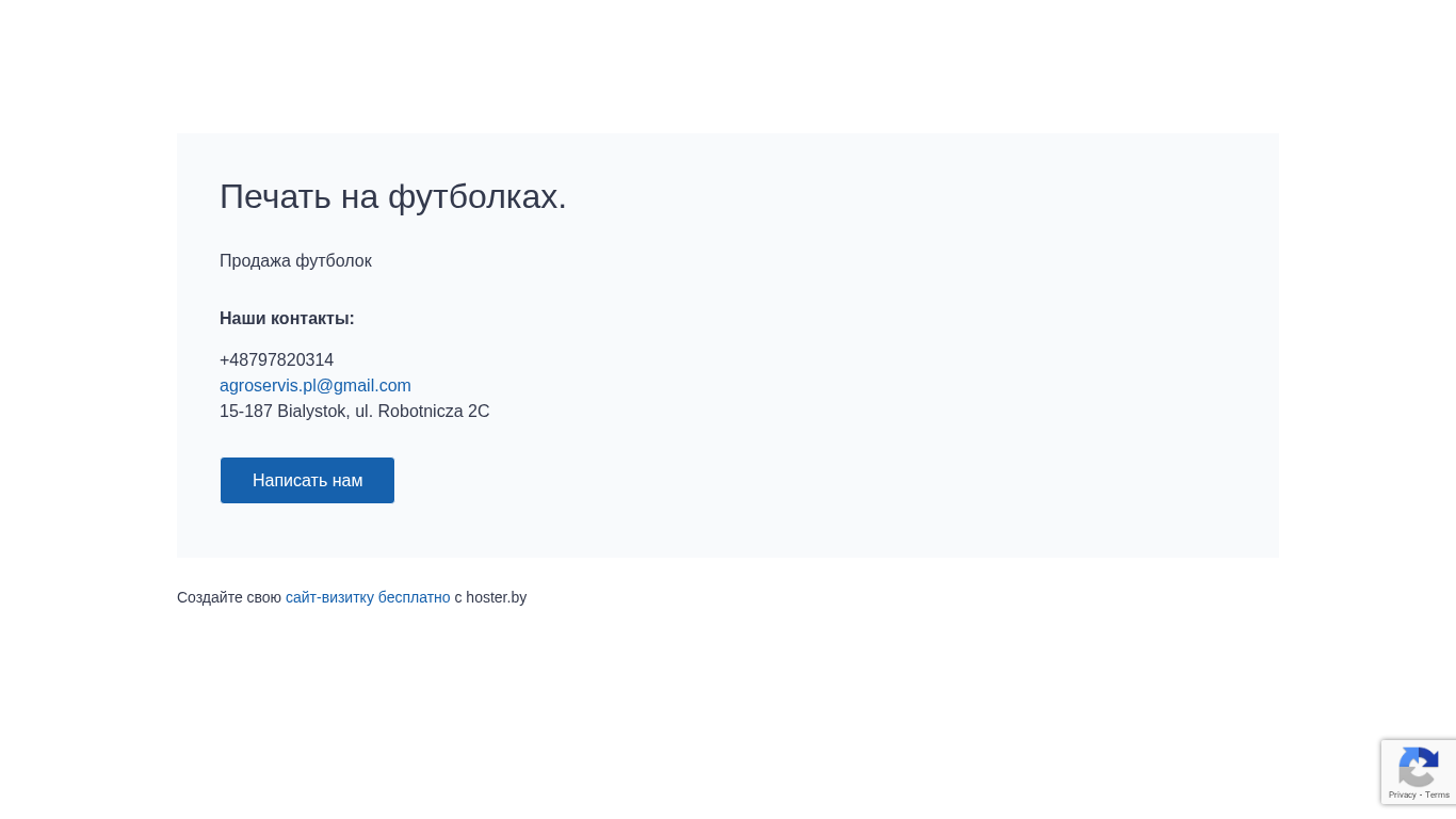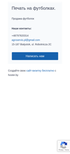 | AI-анализ | This website is titled "Печать на футболках" (Printing on T-shirts) and sells football shirts. The contact information provided includes a phone number, an email address, a location in Bialystok, Poland, and an invitation to write a message. The website also offers a free website visitor card through hoster.by. The form requires the user to verify the correctness of their phone number, email address, name, and message before submission. The top words on the page are "проверьте" (check), "корректность" (correctness), "введ" (enter), "нного" (the), "поля" (fields), "печать" (print), "футболках" (T-shirts), "сообщение" (message), "продажа" (sale), "футболок" |