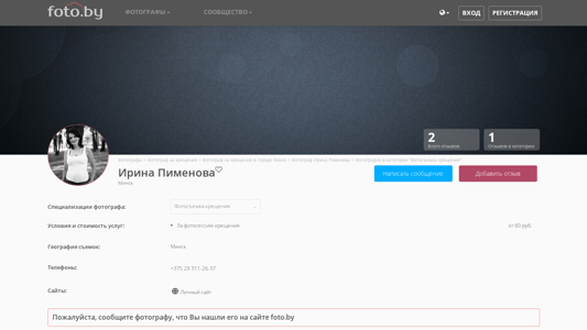 | AI-анализ | This website is a photography portfolio of Irina Pimenova, a photographer based in Minsk, Belarus. The website features a category dedicated to photographing baptisms. Irina works as a family photographer, newborn photographer, and photographer for baptisms in the cities of Minsk. The website also includes information about her services, pricing, and contact details. |