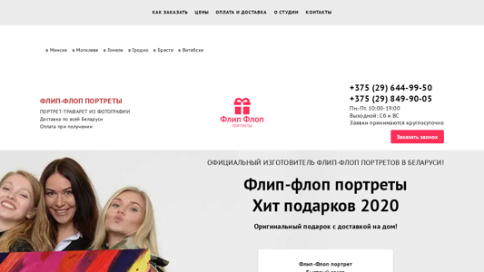 | AI-анализ | This online resource specializes in creating custom Flip Flop portraits using a photo as the basis for the design. Customers send in a photograph, and the studio manually creates an illustration, cuts out the trafarett from the film using a cutting plotter, and applies it to a canvas. The package includes brushes and decorative elements. Customers then paint the image, apply a special film, and after removal, they reveal the image from the photo. The studio offers Flip Flop portraits for delivery across Belarus. Prices, payment, and delivery information are available through the provided contacts in Minsk, Mogilev, Gomel, Grodno, and Brest. The studio is the official manufacturer of Flip Flop portraits in Belarus. Flip Flop portraits are a popular gift item for 2020. The studio |