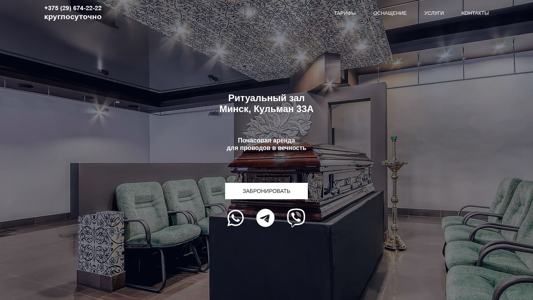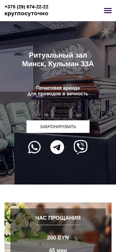 | AI-анализ | The portal is a funeral hall rental service in Minsk, Belarus, called "Ритуальный зал аренда Минск Кульман 33А центр центральный район." The website offers various rental options, including a 45-minute chapel rental for 200 BYN and an overnight mourning service for 790 BYN. The facility can accommodate up to 150 people and features a conditioned environment, comfortable furniture, and fresh drinking water. Ritual items and a delicately trained staff are also provided. The hall is located in the city center and has ample parking space. Cleaning services are available after each ceremony. For inquiries or to make a reservation, contact +375 (29) 674-22-22. Additional options for organizing funerals in Minsk can |