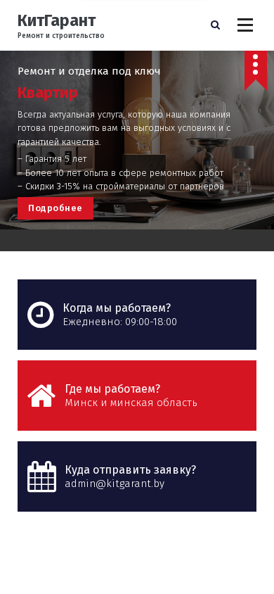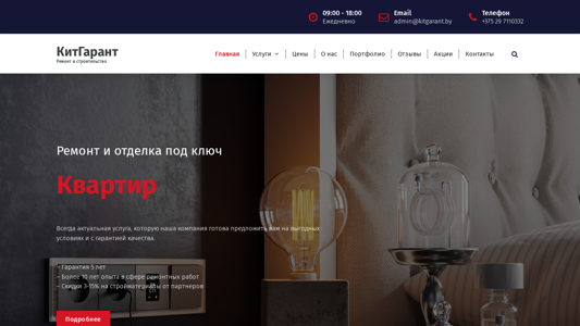 | AI-анализ | --- The portal KitGarant.by offers apartment and house repair services in Minsk of any complexity. It includes various types of renovation works, such as plastering, tiling, and carpentry. The site provides a free quote, adheres to deadlines, and offers materials at wholesale prices. The services include bathroom and kitchen renovation, wall repair, and installation of partitions. The site also offers electrical, plumbing, and heating system installation services. The site operates from 9:00 to 18:00 daily and can be contacted via email or phone. The company provides repair and construction services. |
