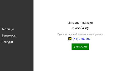 | AI-анализ | The portal texno24.by is an e-commerce website specializing in the sale of gardening equipment and tools. The title of the website is "Садовая техника со скидкой" which translates to "Gardening Equipment with Discounts." The description provides no further information. The website uses the keywords "садовая техника," which means "gardening equipment," and "техника," which means "technology" or "equipment," multiple times. Other top_words include "интернет-магазин" (online store), "продажа" (sale), "садовой" (gardening), "техники" (technology or equipment), "инструмента" (tools), and specific product types such as "теплицы" (greenhouses), "бензокосы" (gas |