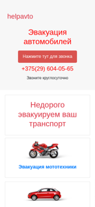 | AI-анализ | --- The web project "Helpavto.by" offers evacuation services for vehicles in Minsk, Belarus. The keywords associated with the site include "evacuation," "auto," "company," "transport," and "special technology." The title and description of the site are both "Эвакуация авто в Минске" (Evacuation of cars in Minsk). The site includes a phone number, "+375(29) 604-05-65," to call for services and states that they are available around the clock. The site promises affordable evacuation services for various types of vehicles, including motor technology and special equipment. The site also mentions a recommended service station, QR Service, for vehicle maintenance. The owner of the business is named Vladimir, who is an individual entrepreneur specializing in vehicle evacuation. He promises a quick and professional service |