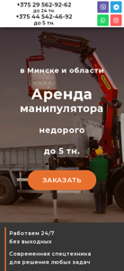 | AI-анализ | The web project "Arenda Manipulyatora" is an equipment rental service based in Minsk and the surrounding area, specializing in crane rentals. The title of the website translates to "Rent a Manipulator in Minsk and the Region," and the description provides contact details for booking a crane with a lifting capacity of up to 5 tons, as well as larger cranes with a lifting capacity of up to 24 tons. The website offers affordable rates for crane rentals, operates 24/7 without weekends, and provides modern specialized equipment for various tasks. Users can contact the company through Viber, Telegram, WhatsApp, or Instagram, or leave a request on the website. The rental cranes have a lifting capacity of 5 tons, a boom length of 6.8 meters, and a truck length of 5.3 meters. The |