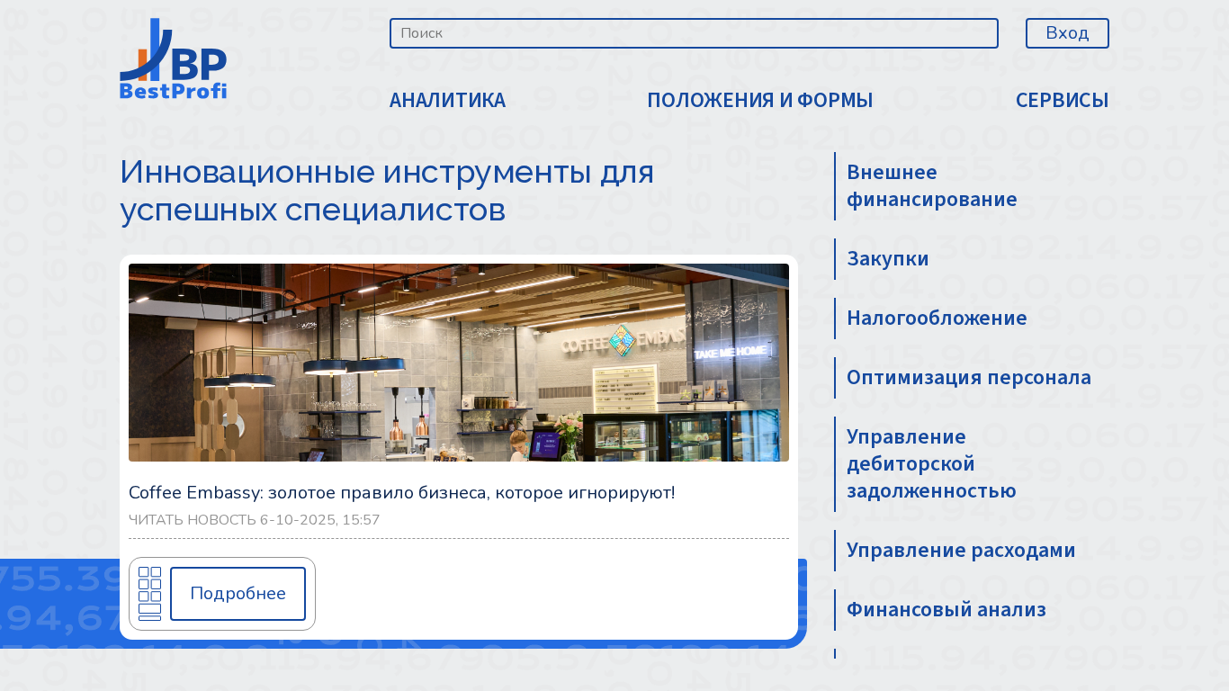 | Ключевые слова | BestProfi калькуляторы сервисы финансирование закупки налогообложение управление персоналом дебиторская задолженность ценообразование управление затратами финансовый анализ |