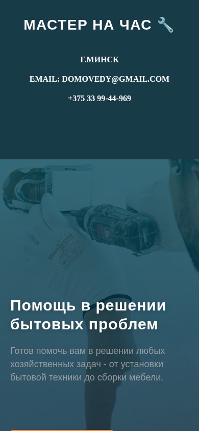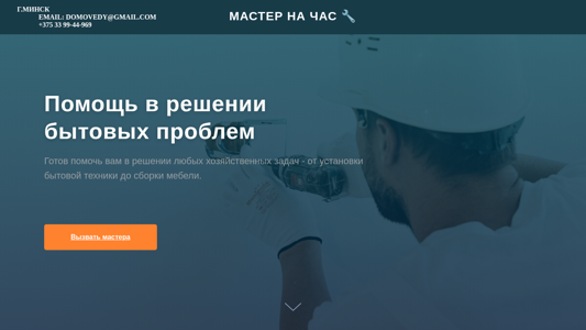 | AI-анализ | The website 'Master na chas' is a service platform based in Minsk, Belarus, offering help with various household tasks. The title and description of the website are 'Мастер на час' which translates to 'Master for an hour'. Users can contact the service by email at Domovedy@gmail.com or by phone at +375 33 99-44-969. The website provides assistance with a range of household problems, from installing appliances to assembling furniture. Users can place a request for the service by leaving a form on the website or by calling the provided number. Once the request is made, the master will contact the user to discuss the scope of work, arrange a visit, and carry out the task in a timely and quality manner. Payments can be made in cash or by credit card upon completion of the service. |