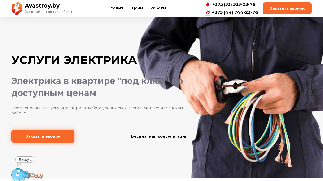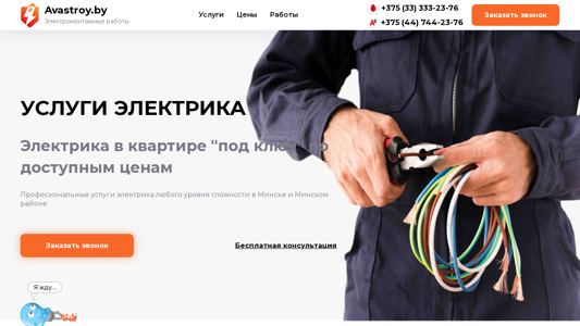 | AI-анализ | The website Avastroy.by offers various electrical services in Minsk and the Minisk region under the title "Services of Electrician in Minsk – Electro-montage works under key." The company provides professional services for electrical works of all levels of complexity. Clients can call for a consultation, order separate electrical works, or request a full spectrum of services for the installation or renovation of electrical wiring. The website lists the minimum prices for popular electrical services without including the cost of materials or transportation. The exact price depends on the complexity of the electrical montage works, availability of materials, and transportation costs. Clients can contact the company via phone or messaging apps for consultations on specific issues and pricing. The website provides a comprehensive list of electrical services, including the installation of electrical sockets and switches, thermal flooring installation, connection of household appliances, plastering of walls, electrical technical expertise, and |