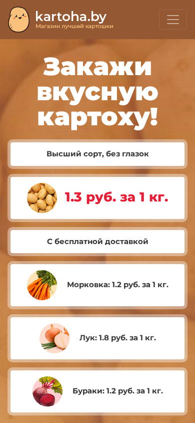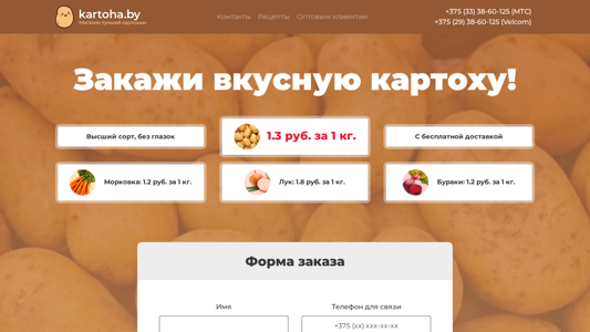 | AI-анализ | The web project "Kartoha.by" is an e-commerce website specializing in the sale of potatoes (carrots, beets, onions, and lifts) with an option for delivery to customers' apartments in Minsk. The website offers prices for different types and quantities of potatoes, including 1.3 rub. per kilogram for high-quality potatoes without eyes, and 2 rub. for delivery to customers' apartments. The site also provides a form for customers to place orders, enter their contact information and delivery address, and specify the number of bags needed. The homepage also includes links to the "Contacts" and "Recipes" sections, as well as a "Premium Clients" section offering a 5% discount for customers making orders of five or more bags of potatoes. The site displays the last five relevant customer reviews and includes a link to the creator, dazeweb |
