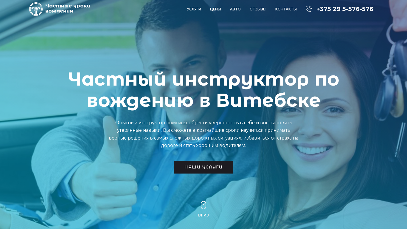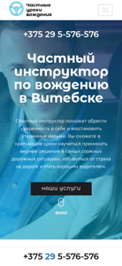 | AI-анализ | The web project "Частные уроки вождения в Витебске" (Private Driving Lessons in Vitebsk) is a website offering driving lessons in Vitebsk, Belarus. The website provides information on services, pricing, and contact details for a private driving instructor. Users can learn to make correct driving decisions in complex situations, overcome fear on the road, and become confident drivers. The website offers various services including confidence building behind the wheel, preparing for the driver's license exam, and on-track and on-route GAI training. Pricing is democratic with individualized approach. The instructor's name is Vyacheslav Kapitonov and the website provides testimonials from satisfied clients, including a doctor, a housewife, and a businessman. The website also includes contact information, operating hours, and social media links. The driving instructor uses a Sk |