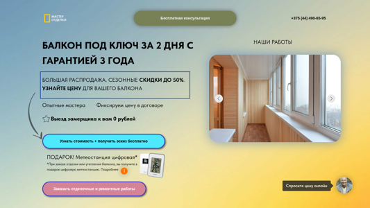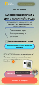 | AI-анализ | The website is dedicated to balcony and loggia renovation in Belarus. Current offers include free consultation and significant seasonal discounts of up to 50%. The website provides quotes for balcony projects and offers a variety of options including PVC panels, underfloor heating, and different types of railings. Customers can contact the company for a free measurement and receive a discount of 10% on the total cost. The website features several completed project examples and allows users to request a quote with their contact information. |
